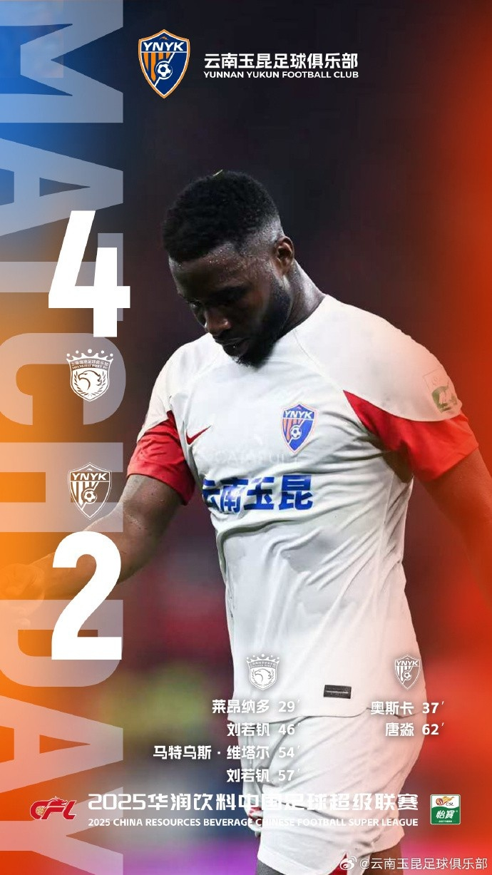 2025华润饮料中超联赛第24轮,客场作战的云南玉昆最终以2比4不敌对手。上半场,奥斯卡接侯永永的助攻,头球破门一度扳平比分。但下半场开场后,在10分钟之内我们被对手连进三球。随后,唐淼打进加盟后个人首球。