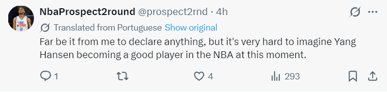 美球迷:我绝不会发表任何言论,但此刻很难想象杨瀚森能成为 NBA 的优秀球员。